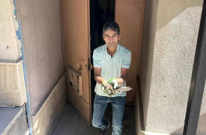 Sivas'ta Kongre Lisesi bahçesinde bulunan yavru şahin, okul görevlisinin dikkati sayesinde kedilerden korunarak koruma...
